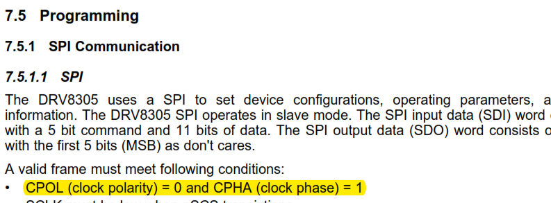 but when i follow the instruction of datasheet,reading from DRV8305 is not default value, and when i do setting like:CPOL (clock polarity) = 0 and CPHA (clock phase) = 0 ,the problems have been solved.why?