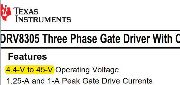 2-) Also, in datasheet it has been written that the DRV8305 should works with the voltage range between 4.4-45v, but my DRV8305 only works with voltage higher than 11v and nfault LED turns off ; it should be noted that i have not connect any thing to 3 phase channels.