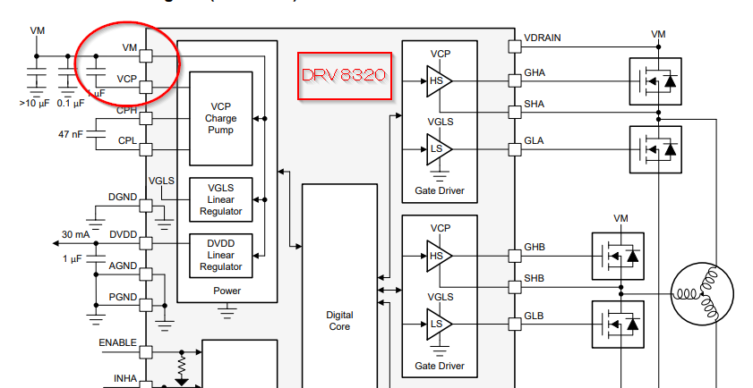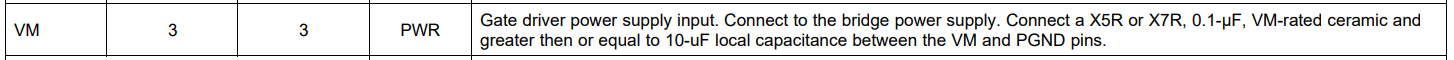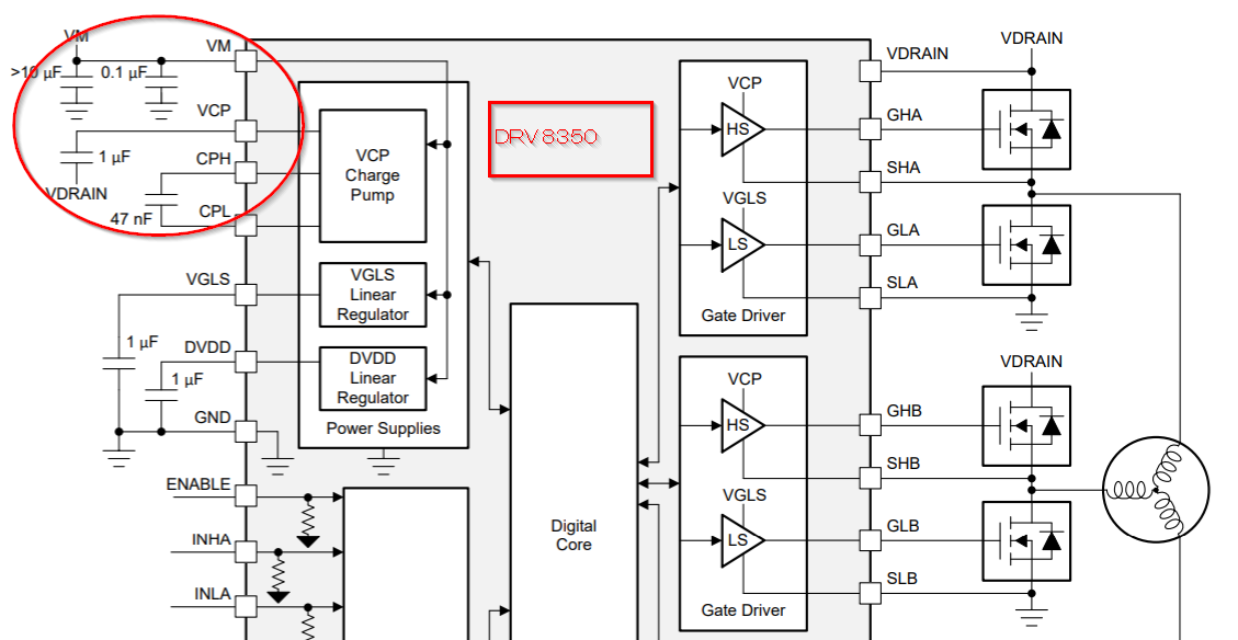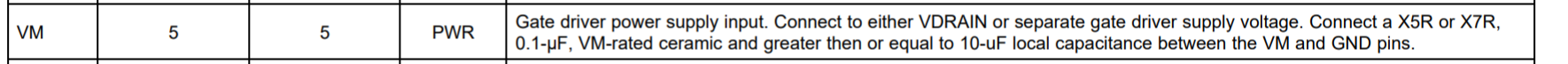 However, another device DRV8353R can be connected to either VM or VDRAIN, it means the power supply for DRV8353R and bridge can be either the same or separate.