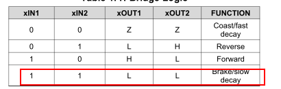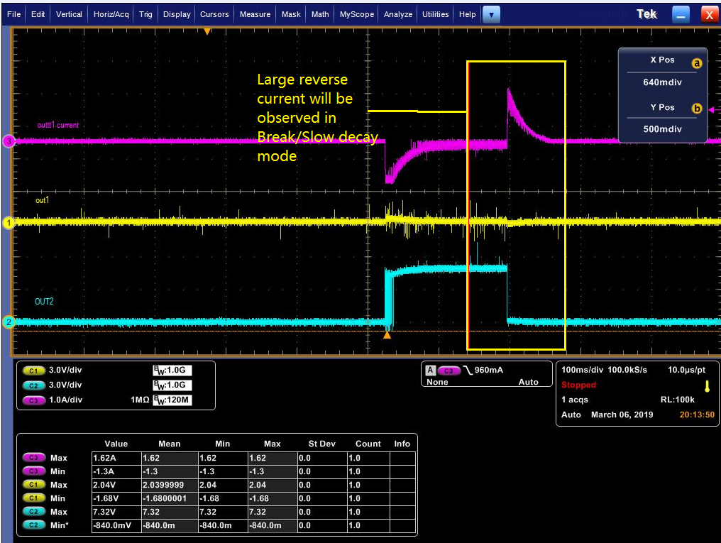 Our customer is evaluating our DRV8833 with a brushed DC motor using our EVM, and found that it will observe a large reverse current in Break/Slow decay mode as below picture shown, can you help to check why it will happen? Thanks a lot!