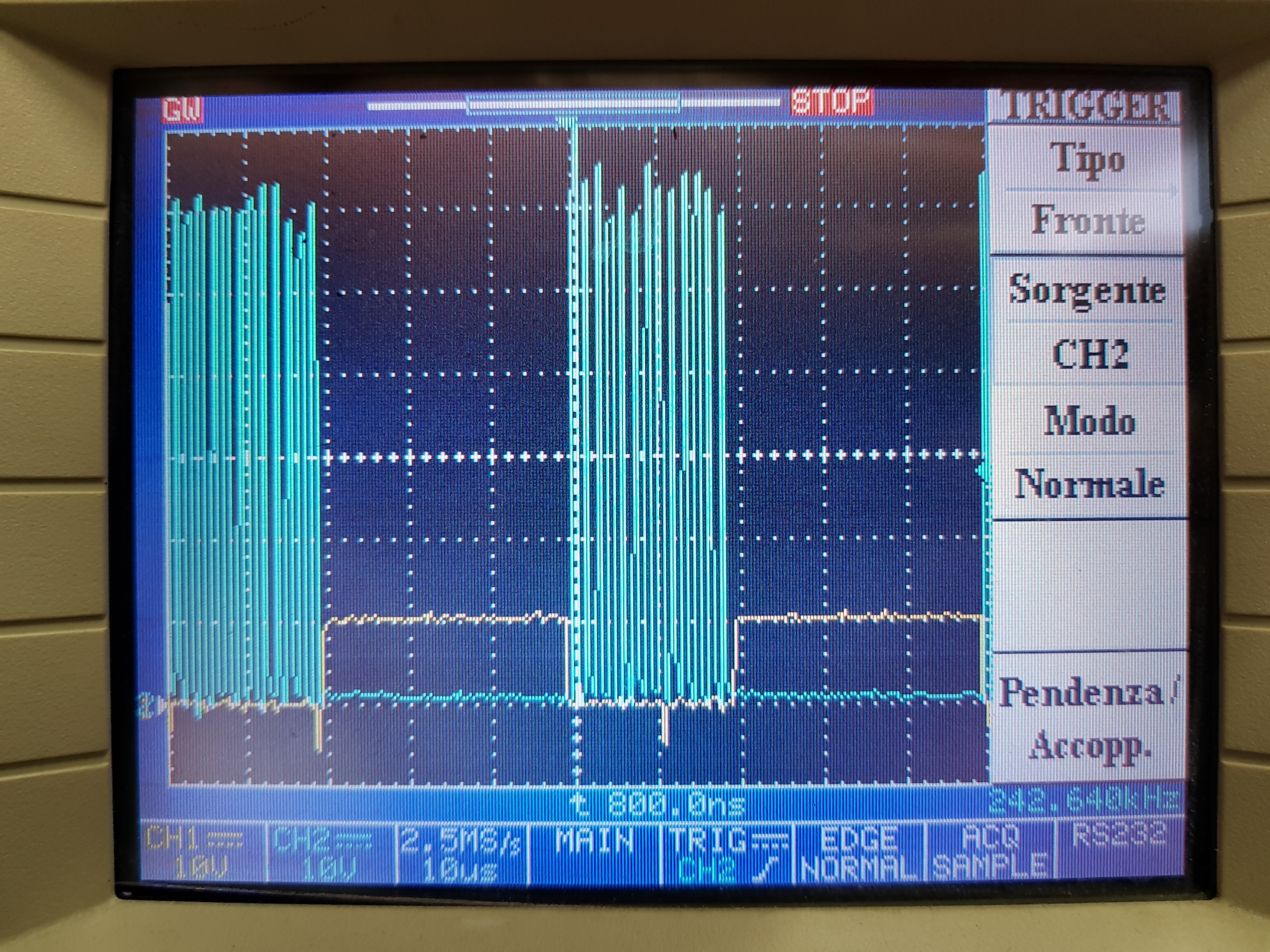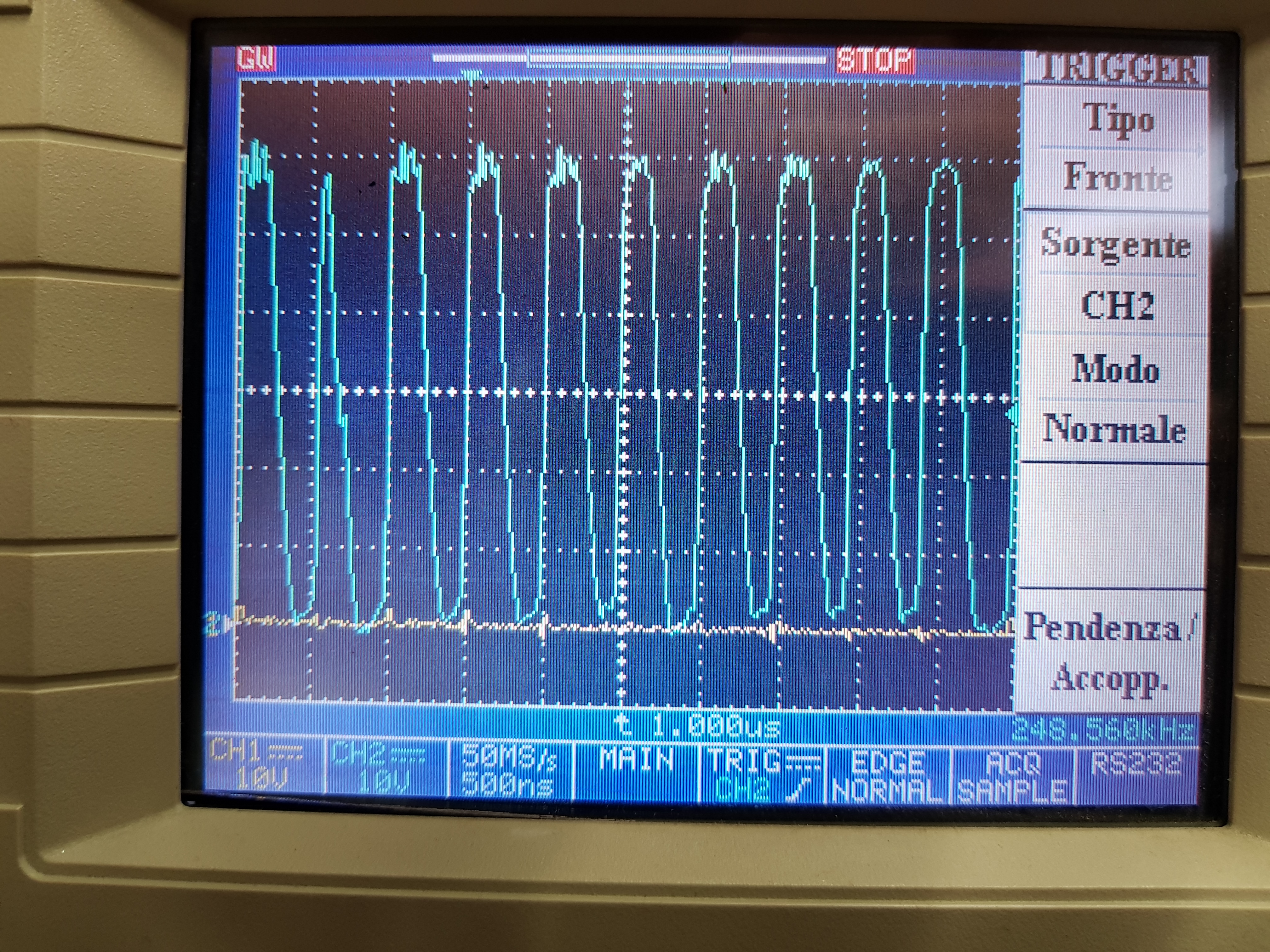 In the photo you can see GHA (blue) and GLA (yellow). PWM duty now is 40% @ 20 kHz, V motor is around 54V (48V batteries, fully charged). Here below you can see an elarged detail: