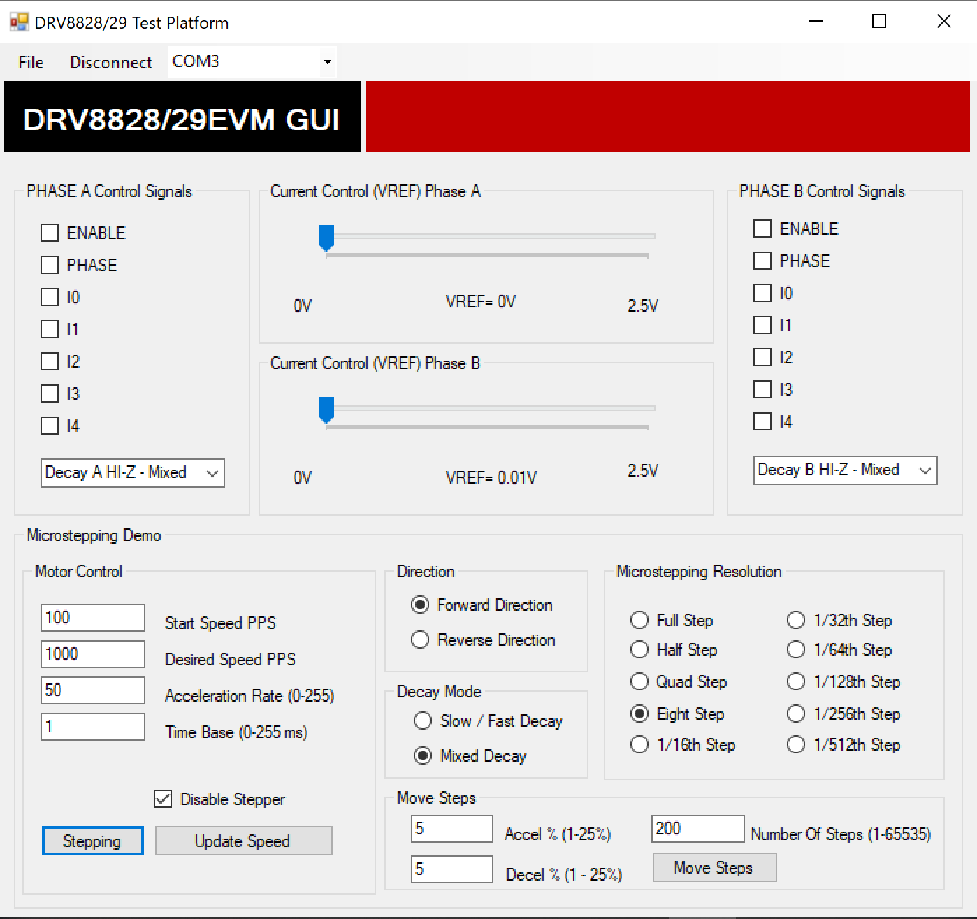2-1 : When all check boxes were cleared in the Control Signals, the motor moved when the start steps button was pressed the in Stepper Control Screen.