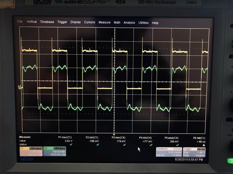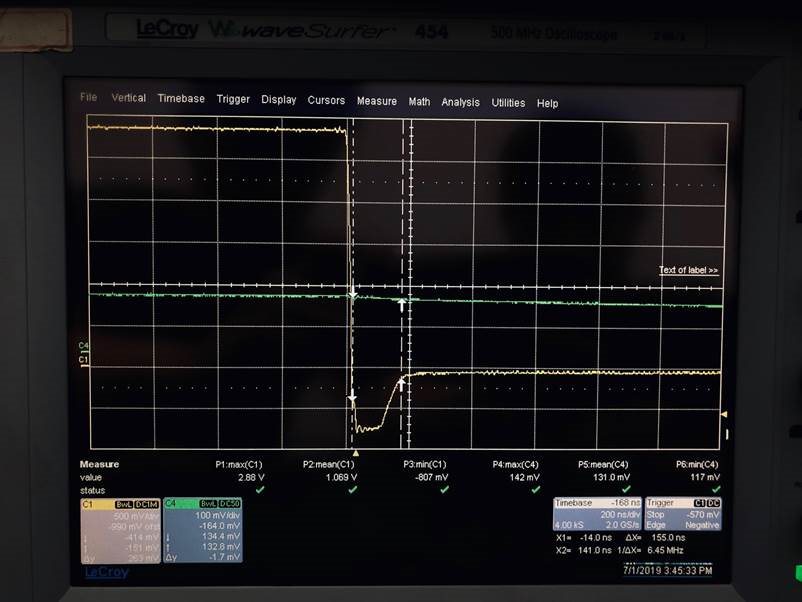 The waveform shows the overshoot and undershoot at the output is apparently large (-800mV) around 155ns.