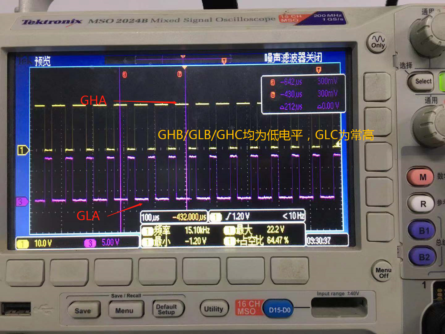 power supply voltage is 12.5V, the driving frequency is 15kHz, and the duty ratio is 65%. When driving a 12V motor, the motor does not change phase, the current is about 4A, and the normal should be about 2A. The FAULT foot is reported without failure. Starting state: DIR high level, A: 0 B: 1 C: 1 The following is the test picture