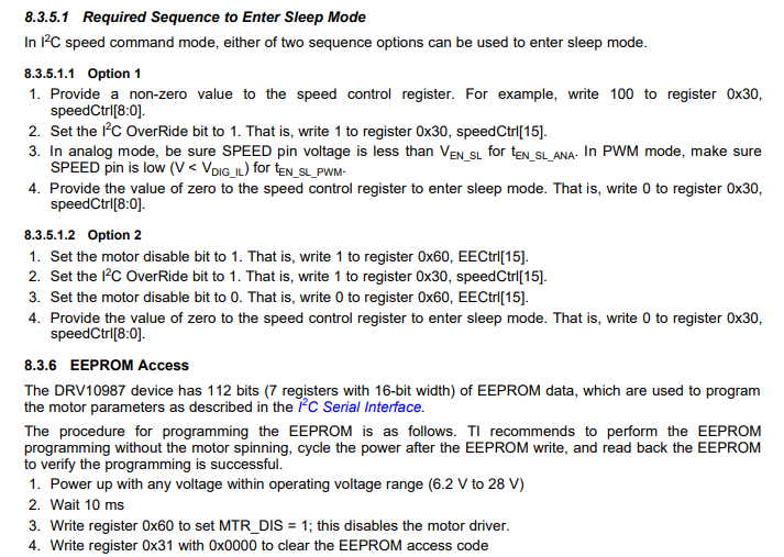 i am using DRV10987D as a driver for Ceiling Fan. 10987D working well but IC is not going into sleep mode. I have entered 0 as a spped command through GUI and providing 0V on speed pin for more than 30 min but it is taking 7mA current.