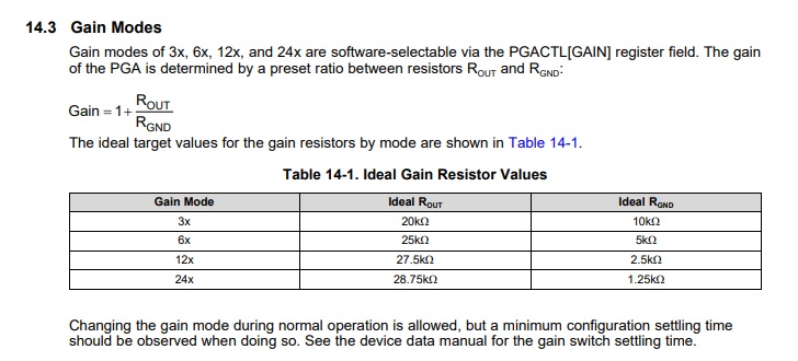 I see that we can adjust the current sense from default 12 to 24 with the PGA but with the recommended resistor values the full scale is still much to high. Are we able to user a gain/voltage diver to decrease full scale and increase resolution then adjust USER_ADC_FULL_SCALE_CURRENT_A from user.h? What is a good rule of thumb for head room? Should we also adjust the cap values? Is there an advantage of using one gain over another?