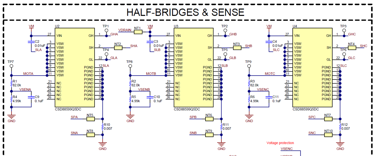 We also have the same question for the voltage sense? If we adjust the voltage divider, R1/R4, R2/R5, and R3/R6 do we only need to adjust USER_ADC_FULL_SCALE_VOLTAGE_V in user.h? How much heaqd room should we allow? Should we also adjust the cap values?