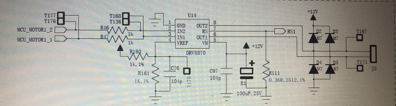 We use DRV8870, Rsense = 0.36, Vref = 2.5V, target current limit is 700mA. SCH is as below.