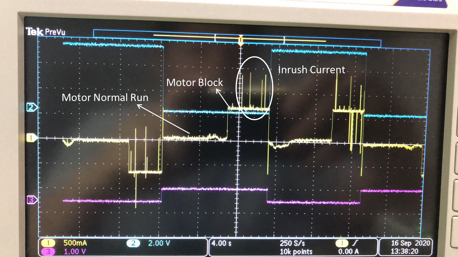 But when the motor is blocked and keep blocking there, the current waveform measured @J5 is as below. Very confused why the current looks like this and does below block waveform normal?