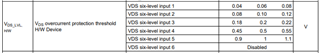 I think you are referring to the DRV8705H-Q1 which is the hardware variant and external resistors are used on the VDS pin to set up to 6 different levels. There is a table in the datasheet that specifies the 6 possible levels for the drain-to-source voltage across the external FETs. When this threshold is exceeded, an overcurrent fault will occur.