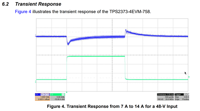 It looks like there is a typo in that the figure shown says 7A to 14A transient but looking at the 5A/div this Figure is showing the transient response from 1.4A to 14A.