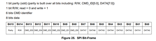 "1 bit parity (odd) (parity is built over all bits including: R/W, CMD_ID[5:0], DATA[7:0])"