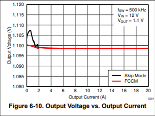 Note: The TPS53353 uses D-CAP mode control, which regulates the valley voltage of the output ripple, not the average, and the reference voltage is increased slightly when zero-current is detected cross the low-side FET during the low-side FET on-time (Load currents below critical conduction). If the MODE pin selects auto-skip operation, the output ripple voltage will also increase as it enters DCM operation. This increase in Vfb(avg) and thus VOUT at light load is noted in figure 6-10