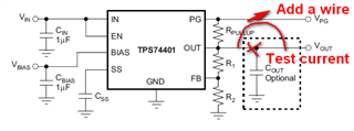 In our design, we need to test the TPS74401 LDO output current. Because the OUT pin does not have a string of magnetic beads, we cut the OUT pin and the power plane during the test, and then connect a wire in series to obtain the current through a current clamp.