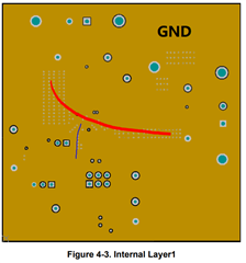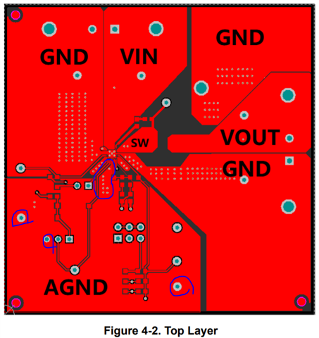 To my knowledge, AGND and GND are separated at the top layer just like the EVM, and connected thru a short trace of thru a 0ohm resistor, so that the noise is hard to be injected to AGND plane. But it looks the connection to GND plane thru many vias cannot effectively isolate AGND from GND switching noise. Could you help me to understand the recommendation layout here?