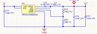 I'm using TPS561208 in my circuit. Vin=5V and I want to get 3.3V at output pin. I designed the schematic as same as Webench circuit. But I'm getting 3.6V constantly.