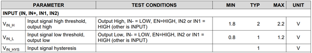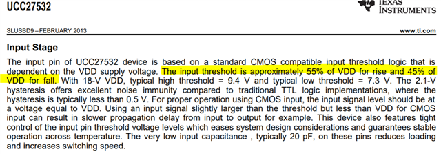 The UCC27532 has an input threshold voltage that is dependent on the VDD voltage.