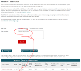 This data (0.1 FIT for TPS57114QRTERQ1) that you find on TI’s reliability estimator is the classical MTBF calculation based on the real TI reliability testing of real samples (HTOL, ELFR, etc.) normalized to a duration of 1000 h at a test temperature of 125°C (for details see the explanation on the link). Currently the device data, based on a sample size of 166651 tested for 1000 hrs and zero fails, gives a FIT rate of 0.1 . The FIT rate is very low due to the high sample size and high device hours for this mature technology.