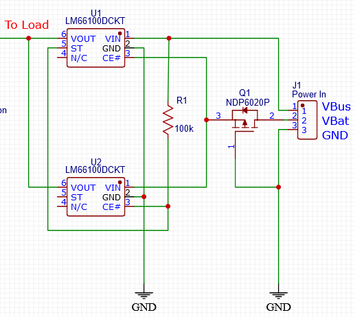 The aim is to power the load from the VBat source until the VBus power source is connected, which then takes over powering the load (also charges the battery separately via a different circuit not shown below). I'm trying to determine the best way to wire up the CE# pins between the two LM66100's so that it minimises the drain on battery (such as parastic pull up/down resistor loads) when the VBus source is not present.