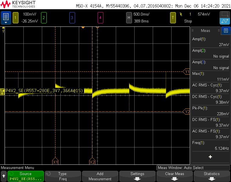 Currently the module is operating at 730 KHz. When I changed it to 630 KHz, condition 1 improves (i.e no noise heard till 5.7A) but no changes in condition 2.