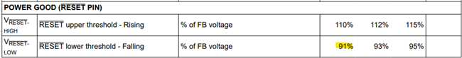 My customer is planning on using our fixed 5.0V LM63615-Q1, and is attempting to achieve a 4.75V minimum RESET threshold. Unfortunately, our RESET threshold puts as at 4.55V (91% of 5V):