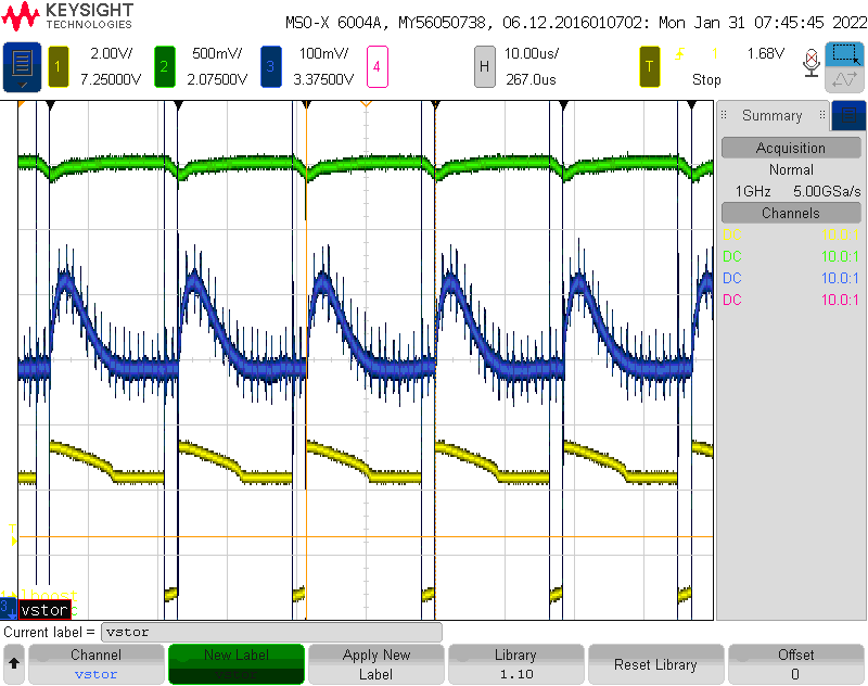 We're using the BQ25570 to charge a 3.2V LiFePO4 4000mAh battery in a pure harvest charger only scenario and have ROV1 and ROV2 configured with VBAT_OV set to 3.6V using the work spreadsheet. Our solar panel produces up to 7V so we're using a 4.2V low-loss voltage regulator to ensure the BQ25570 doesn't get a higher voltage than its rated maximum. For testing purposes we're using a 4.2V 500mA bench supply source with low impedance.