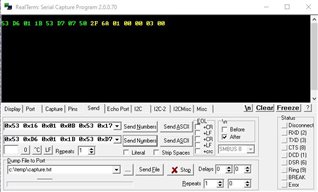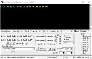 Shown below is the same data (in yellow) captured with the RealTerm serial terminal.