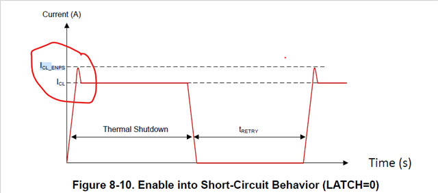 1) In customer's application, when TPS1HC100-Q1 or TPS1H100-Q1 is used to drive relays, the pulse current waveform through HSS could look like 5.5A/300ms, 9A/200ms. My question is, if the maximum current limit is set to 6.9A, will TPS1HC100-Q1 suffering from thermal shutdown with 5.5A/300ms? By the way, what is the response time for current limit circuit if 9A/200ms pulse current is applied? Will the load current be clamped to ICL as expected too early?