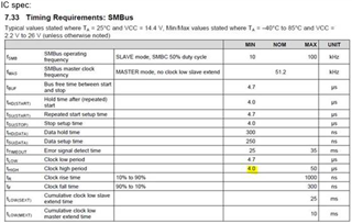 per system testing, it's found that the SMBus communication Thigh (clock high period) can be 3.905us