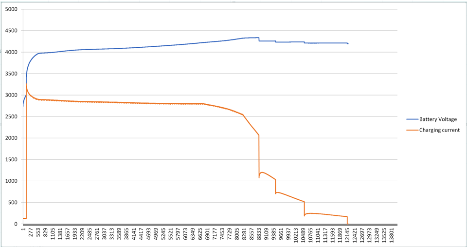 To see smooth decay in the CV phase of charge you will need to turn off IR compensation by adjusting REG08 to = 0 (00000000)
