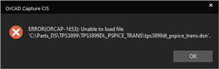 1. I tested the TPS3899 PSpice Transient Model (Rev. A) and the TPS3899DL_PSPICE_TRANS.DSN error opening the file on OrCAD 17.4 pspice