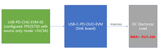 I was trying to measure TPS25750D's output current on USB-PD-CHG-EVM-01. And I decided to use USB-C-PD-DUO-EVM to draw current with electronic load.