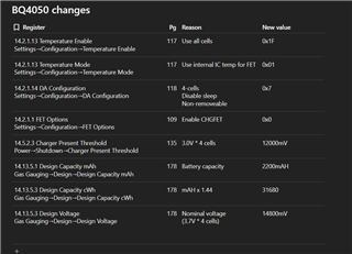 Stuck on this. I've configured the 4050 for our application setting cell count, FET enable, capacity etc and for reasons not obvious to me I can't charge or discharge. If i use the "CHG_FET_TOGGLE" or "DSG_FET_TOGGLE" i can charge/discharge normally at high currents (everything looks good). I've read through the protection section of the datasheet and from what i can see any fault would be reported in the Battery Management screenshot below: