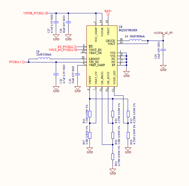 we build a small system with two BQ25570 for piezoelectric and solar harvesting source as shown in the figures: