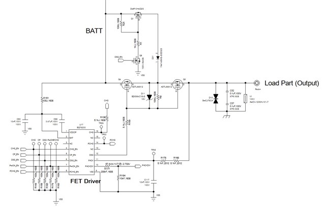 By connecting the signal on the DSG_EN side of the BQ76200 with the circuit for turning on the NMOS above the circuit, the batt voltage is supplied to the common source side of the DSG FET. When DSG_EN is lowered to