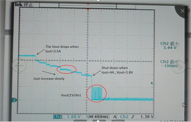 The Vout drops when Iout=3.5A (As I calculate, ΔIL=1.196A in this condition). Then slowly increasing the Iout. When Iout=4.0A and Vout=1.8V, the 82130 shut down. Then the Vout fluctuates between 0V and 1V.