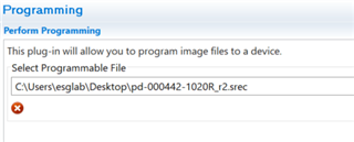 I am able to export an .srec, but I am unable to program a .srec. I again confirm that SEC0 and SEC1 are both red. When I try to program, something quickly flashes on the screen, and then I get what you see below.