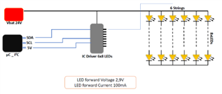 Vbat=24V, (If=100mA, Vf=2,9V each LED) 6x8 or 8x6 LED string