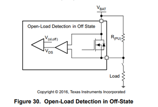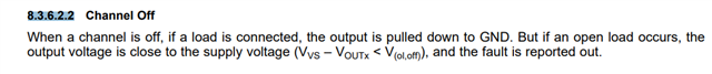 As datasheet said, if an open load occurs, the output voltage is close to the supply voltage (VVS – VOUTx < V(ol,off)), and the fault is reported out.