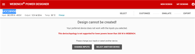 Our customer would like to know why simulating the UCC28950 phase-shift-full-bridge controller in Webench is not supported for lower powers lesser than 300W as shown in the screenshot below. Section 8 of the UCC27714EVM-551 evaluation module shows the test data of the device at 60W output. Do we have another phase-shift-full-bridge controller that is suitable for 200W application?