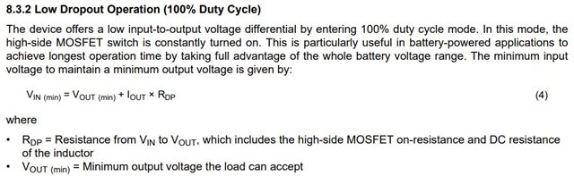In low dropout operation, equation(4) is adopted. So if Vin=3.3V(max of RDP is 80mΩ) and Iout=3A, drop voltage is 0.24V at FET and inductor.