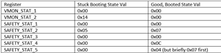 I get the following register readings out of the SPI bus, taken during the Stuck bootup phase and again once the VDDx rails finally come up: