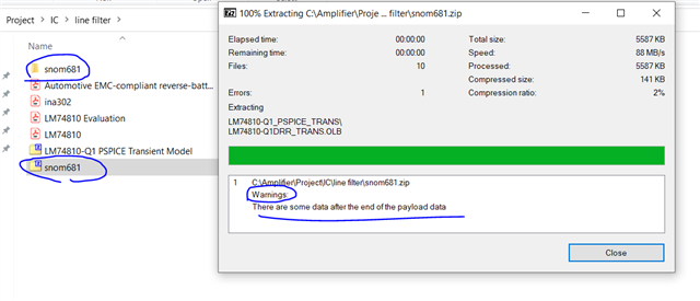 may be a problem with the LM74810-Q1 compressed file(https://www.ti.com/product/LM7481-Q1#design-tools-simulation.) ,see below ,when extracting document, show waring.