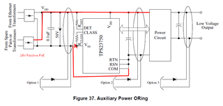 Hello everyone, I am currently developing a PD device, one of the potential options for using it is a 24V Passive POE supplied using an external injector. In the datasheet, in the "AUXILIARY SUPPLY ORing" section, it is indicated that the supply of 24 volts is allowed in the second case, but this applies to the so-called "wall adapters". Is it possible to use Passive PoE adapters, as indicated in the instructions, switching VSS to COM