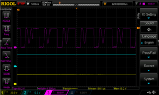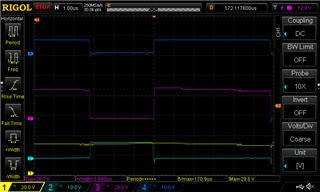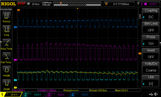 Magenta is switch node, Blue is output voltage (target is 12.5V), yellow is input voltage (initially 30V at 3A)