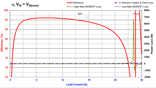 Also I tried the calculation excel file, and the power loss analyzer graph shows a weird behavior when load current exceeds 20A.
