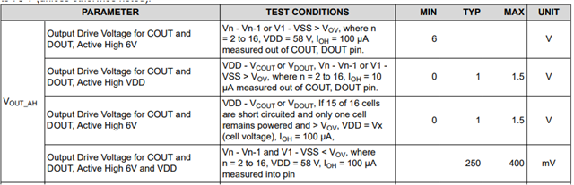 - How should I understand the second spec? If a spin is Active High VDD, and a OV event is triggered, then COUT and DOUT will be pulled to 1V? if yes, why under this situation, only 1V is pulled up?