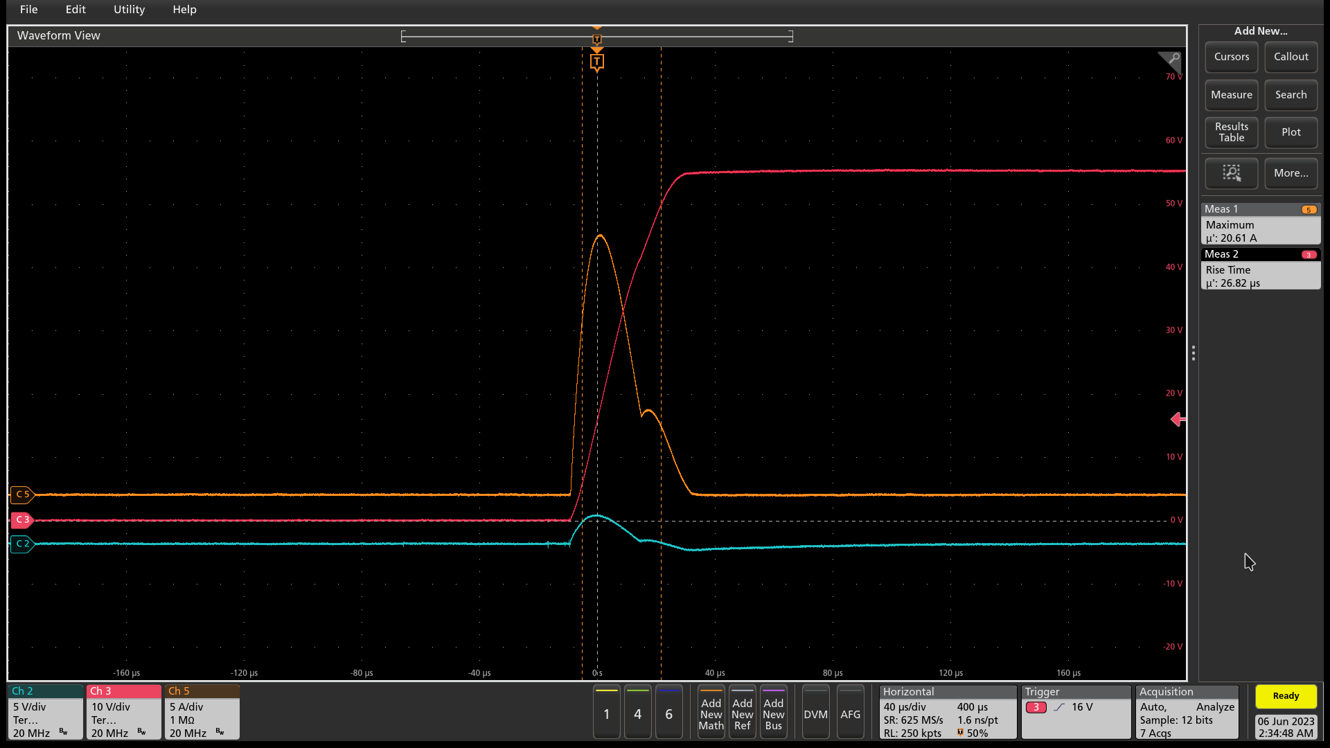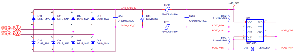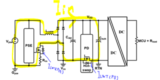 I use TPS2378 on our product, I measured output voltage at TPS2378 (between VDD and RTN pins) and inrush current between PSE (PoE injector) and our device. The ramp up time of the output voltage is very fast, I've measured typically 25 to 30us, see picture below (red line is PoE output voltage, orange is inrush current, ignore blue line). I have a PoE injector with 55V output voltage. There are 4x 2u2 capacitors at the output, so I = 8.8u * 55 / 27u = 18A, I measured about 20A inrush so it corresponds to the capacitors. TPS2378 datasheet says it has "140-mA inrush current limiting", so it is not clear to me why the limiting is not working. I have TPS2378EVM-105 board and I measured same fast ramp and high inrush current on this board too. Do you know why the ramp up and the inrush current is so high? Can I fix it somehow and limit the inrush current?