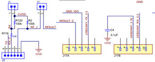 However, changing to J3 connector and following the schematic to communicate correctly (connecting TX, RX, NFAULT and GND), all cell voltages printed are equal to zero, and the LED is off.
