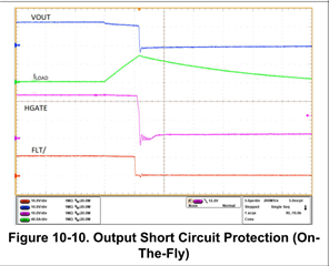 The load current fluctuates badly in the event of an output short as shown in the figure below (red color).